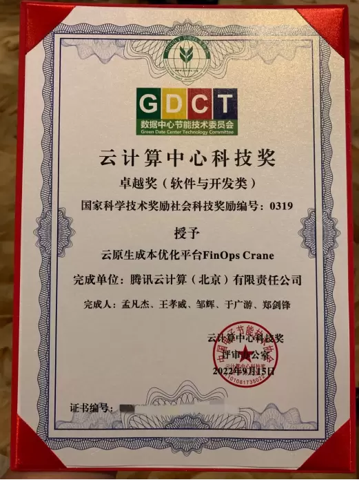 “云计算中心科技奖”由国家科学技术奖励工作办公室审核并备案(奖励编号:0319),是社会科技奖励目录中在云计算中心科技领域给予的唯一奖励,旨在奖励绿色云计算中心中应用的科技创新成果及产品为经济社会发展和国家节能减排事业做出的重要贡献。该奖项的获得,进一步体现了腾讯云FinOps Crane在降本增效、节能减排等方面的突出能力。