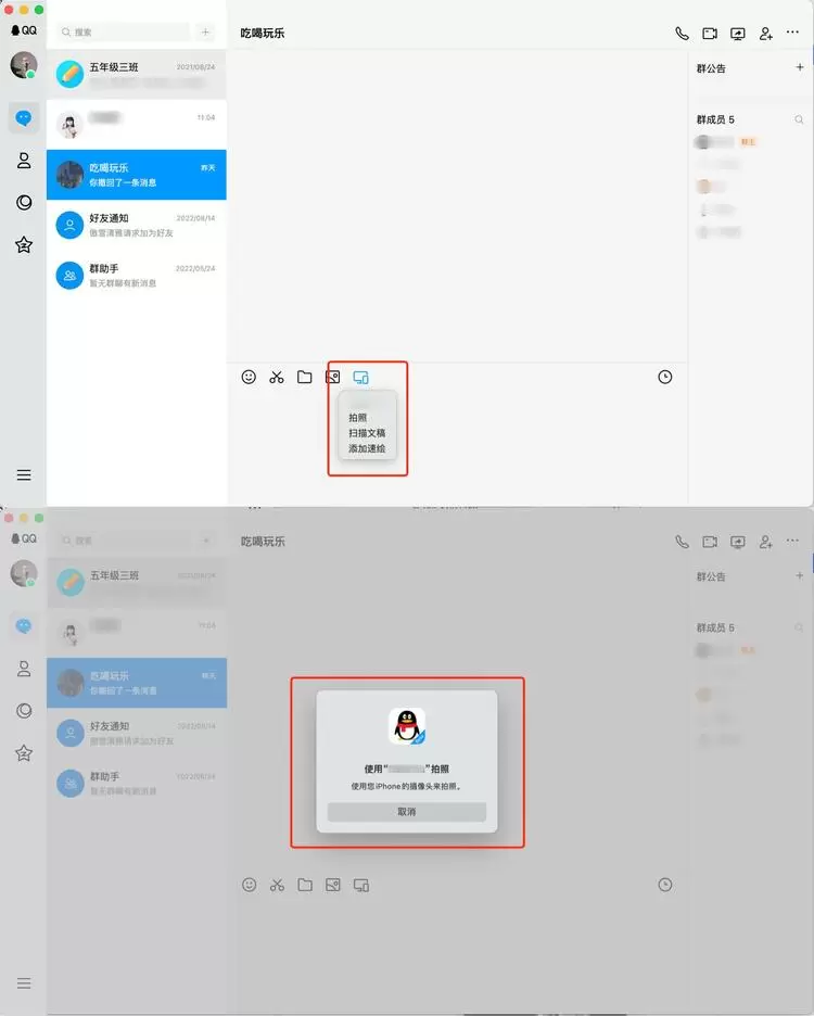 新版本下的Mac OS系统支持连续互通能力,实现了高效操作,当识别到当前有可以使用的移动设备时,用户可以启用移动设备的摄像头进行拍照或扫描,随后便会展示在QQ聊天框内。若用户有编辑绘画的需要,也可将速绘快速添加至输入区。