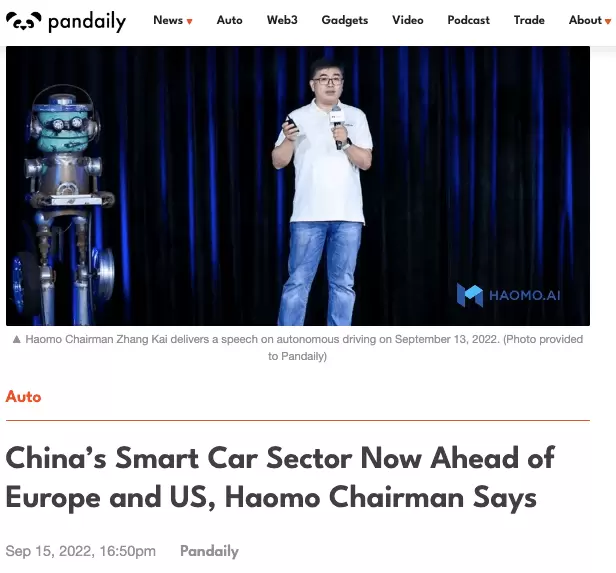 Pandaily近日发表了《China's Smart Car Sector Now Ahead of Europe and US,Haomo Chairman Says》(毫末董事长称中国的智能汽车行业领先欧美)一文。该文多处引用了张凯及毫末智行CEO顾维灏的观点,详细介绍了毫末的6P合作原则、小魔驼相关进展以及5S合作模式,并称凭借毫末智行的优势,长城汽车正在智能化浪潮中保持优势。