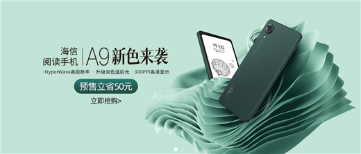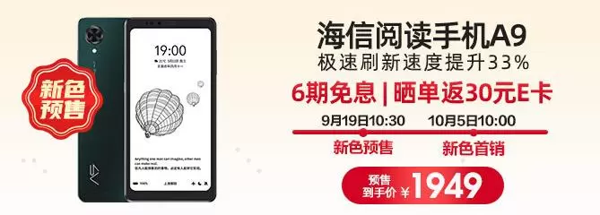 现在下单海信阅读手机A9,立省50元,6GB+128GB版本预售到手价仅需1949元,购机还有6期免息、晒单返E卡等超多福利,喜欢阅读的朋友们登陆海信手机京东自营旗舰店了解详情!