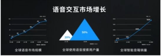首先大家可以看到这是一些咨询机构的数据,无论是用户的使用规模,比如语音搜索,可能从20%,未来变成50%,你每搜十次搜索引擎,有5次是语音的交互方式。这不一定是在手机上,可能是在音箱上,可能在车里面,都是用语音交互做。但是做的事情主要是为了搜索内容。包括大家非常清楚的智能音箱这个市场从无到有,现在全球是几千万的市场。