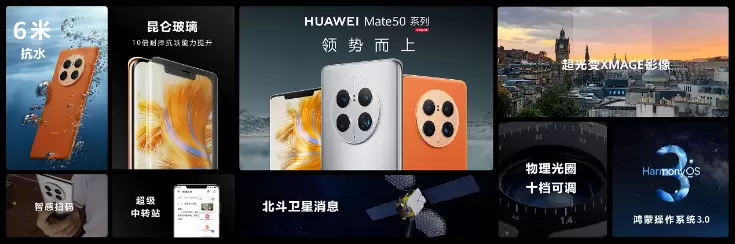 全球首款支持北斗卫星消息的大众智能手机,打通无人区救援的通信壁垒,向上捅破天的黑科技实现畅联九霄,与世界随时保持联系;“不怕摔”的华为昆仑玻璃,相比普通手机抗跌性能提升十倍;关键时刻能应急的“低电量应急模式”,带来更持久的续航体验; 首发搭载常用常新的HarmonyOS 3,带来了流转更方便的超级中转站,为手机内存减负的超空间存储压缩技术等新特性。华为Mate50系列以全面极致科技体验为广大消费者带来了年度旗舰之作。
