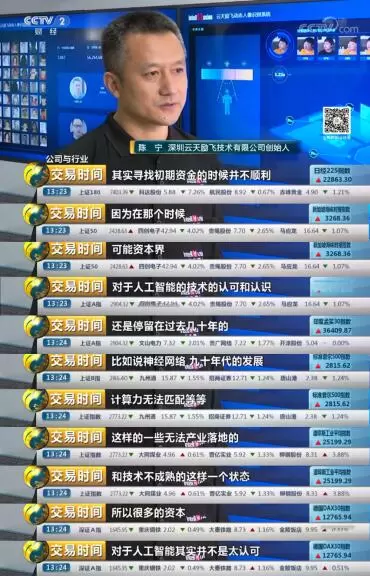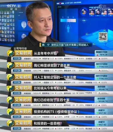 在7月19日下午央视2套财经频道播出的《交易时间》中,以人工智能融资为主题,采访了深圳云天励飞技术有限公司联合创始人兼CEO陈宁博士,报道了云天励飞的融资历程。