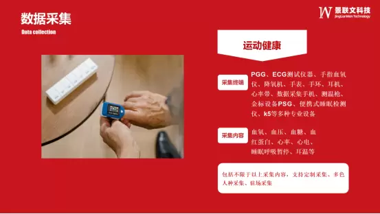 景联文科技构建了全国27个省市直辖市全球52个国家的数据采集网络,储备上万人被采集者资源。针对不同需求的采集项目,客户还可自定义被采集者的人种分布、肤色分布、年龄分布、男女分布、腕径分布等参数,除了常规人群外,景联文还可提供运动爱好者、专业运动员、睡眠呼吸暂停患者等特殊人群资源。景联文科技拥有健身房、游泳馆、操场等多种数据采集专业场地,在全国范围内设有多个二级采集点,可随时根据客户需求单独开辟采集实验室。可根据客户需求提供PGG、ECG测试仪器、手指血氧仪、降氧机、手表、手环、耳机、心率带、数据采集手机、测温枪、金标设备PSG、便携式睡眠检测仪、k5等多种专业设备。