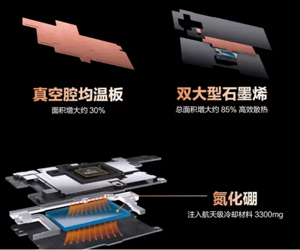 在散热设计上,ROG6天玑系列采用了全新的高阶散热方案——矩阵式液冷散热架构 6.0 Plus。其采用SoC中置、电池位于核心发热区域两侧的结构设计,将发热源远离手持部位,时刻保持良好手感,助力玩家秀出高分操作。3300mg航天级冷却材料氮化硼以及面积大幅提升的均温板和石墨烯等多种散热材质加持,可高效导出热量,即使长时间运行大型游戏依旧可稳定输出。