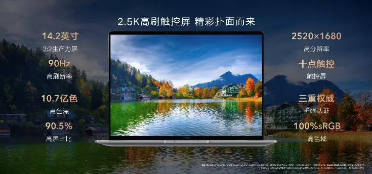 荣耀MagicBook V 14 2022搭载了2.5K高刷触控3:2生产力屏幕,通过国家眼科工程中心护眼认证、莱茵低蓝光护眼认证以及莱茵无屏闪护眼认证,100%的sRGB高色域和10.7亿色高色深保证画面绚丽逼真,90.5%的超高屏带来沉浸式观感。