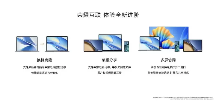 荣耀MagicBook V 14 2022在荣耀互联方面也迎来全新升级,不仅可以轻松完成笔记本和手机、笔记本和平板,笔记本和笔记本之间的文档、图片、视频等内容的分享和传输,还支持多品牌电脑的数据迁移,解决用户更换新电脑时的数据传输痛点,同时多屏协同功能支持与手机、平板、智慧屏的协同,可以实现手机在电脑上的三窗口多开,进一步提高工作效率。