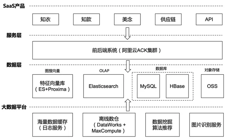 当前知衣在阿里云上的整体方案架构如下,大致分为产品层、服务层、数据层以及大数据平台。