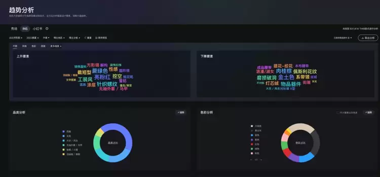知款聚焦于快速发现时尚趋势灵感,集成了社交平台、品牌秀场、零售及批发市场、淘系电商、时尚街拍五大图源,海量的设计灵感参考,帮助服装品牌及设计师快速准确地预判时尚风向,掌握市场动态。其中趋势分析板块就需要对某个季度下各种组合条件下的设计要素标签进行统计分析,并输出上升、下降以及饼图等指标。这也是我们数据量最大的查询场景,扫描分析的数据量量级会接近百万。