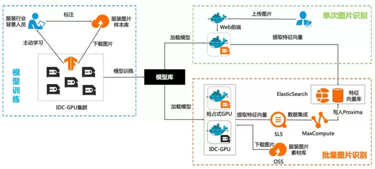 模型生成以后打包到Docker镜像,然后在GPU节点上运行容器服务就可以对海量的服装图片进行识别,提取出高维的特征向量。因为提取的特征向量数据量很大且需要进行清洗,我们选择将特征向量先缓存在阿里云日志服务SLS,然后通过DataWorks编排的数据开发任务同步SLS的特征向量并进行包含去重在内的清洗操作,最后写入向量检索引擎Proxima。