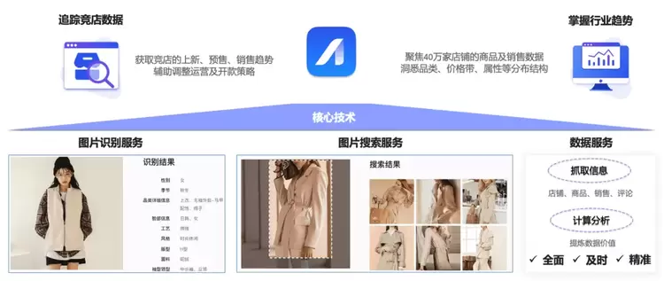 产品层:知衣目前有多款APP应用,如主打产品知衣、增强设计协作的美念等。除此之外,我们还提供定制化API向第三方开放数据接口服务和以图搜图的功能。从数字选款到大货成品交付的一站式服装供应链平台也是核心的能力输出。