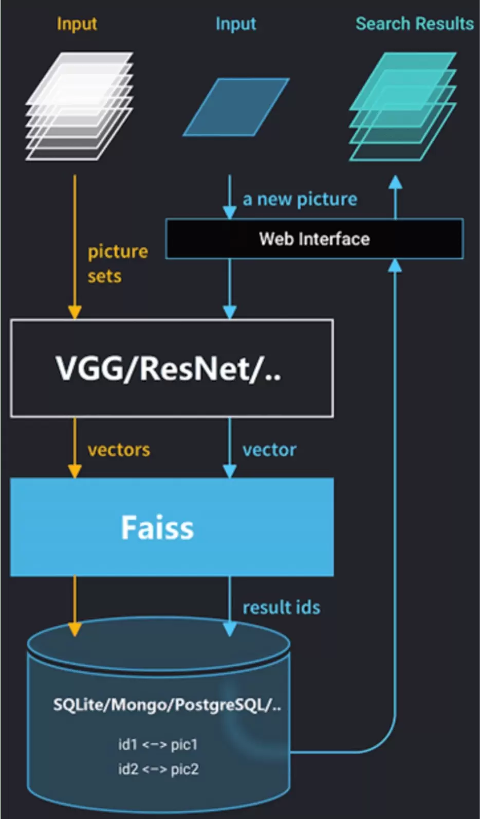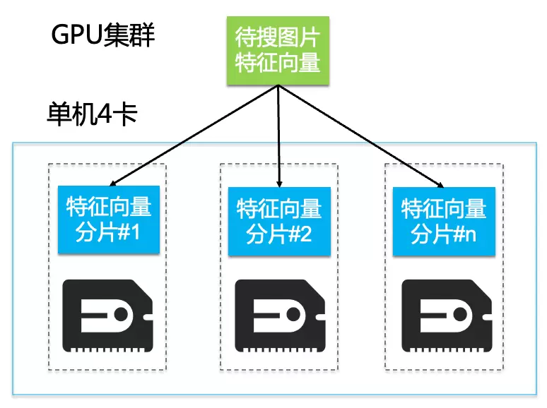 Faiss (Facebook AI Similarity Search) 是Facebook AI 团队开源的向量检索库引擎。初期我们也是选择Faiss部署分布式服务,在多台GPU服务器上部署特征向量搜索匹配服务,将搜索请求分发到每台GPU子服务进行处理,然后将TOP N的相似结果数据汇总返回给调用方。
