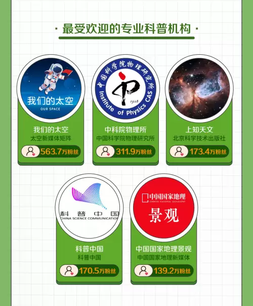 此外,太空新媒体矩阵@我们的太空 @中科院物理所 北京科学技术出版社@上知天文 中国科协@科普中国 @中国国家地理景观 等专业科普机构也纷纷加入抖音自然科普的队伍中,利用短视频、直播等新传播渠道分享各类自然知识。