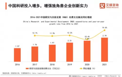 《报告》的另一个重点落在了科技创新上,2021年中国科研经费约为2.79万亿元,同比增长了14.6%。科研投入增多,增强了独角兽企业的创新实力。