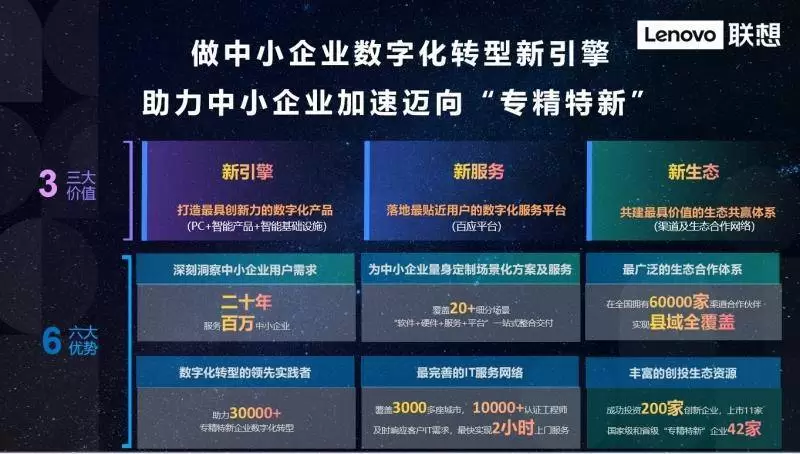 比如,在服务体系方面,联想服务机构已覆盖全国3000多座城市,拥有1万家渠道合作伙伴,实现了县域服务的全覆盖。此外,遍布全国的1万多名认证工程师,可实现2小时上门服务,彻底打通IT服务最后一公里。在资金层面,联想集团旗下的联想创投可以为中小企业提供雄厚的资金支持,目前已成功投资200余家创新企业,入选国家级和省级“专精特新”企业名单的有42家。