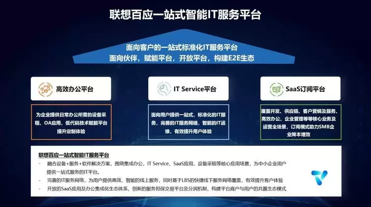 目前,联想百应一站式智能IT服务平台已覆盖20+细分场景,可提供从业务到企业运营管理、从高效办公到IT基础设施和从设备采租到智能IT运维的“软件+硬件+服务”的一站式整合交付,累计为20万家中小企业的数字化、智能化转型提供定制化方案服务。
