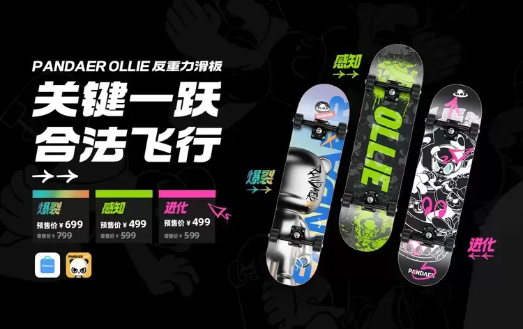 PANDAER秋季新品上新周上,真是大饱眼福!「关键一跃,合法飞行」,PANDAER OLLIE反重力滑板拥有感知、进化、爆裂三款PANDAER定制主题涂装,无论是脱离地面的一瞬,还是滞空展现的一刻,甚至到帅气值爆裂的落地时间,它都能给滑板少年带来出乎意料的精彩感知,让每一跃都做到Pro。