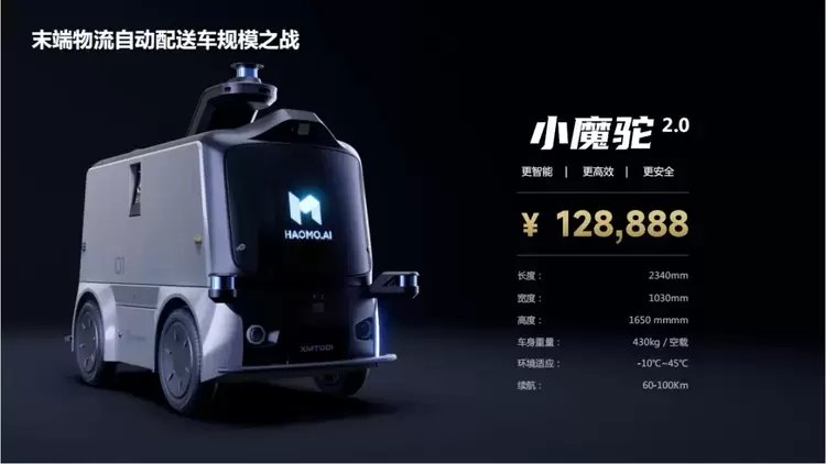 今年4月,售价12.88万元的小魔驼2.0正式问世,面向商用市场的末端物流自动配送车产品首次进入到10万元级别。只过了5个月的时间,小魔驼2.0就已下线交付,预计年产量将达到 1 万台,并且在场景上覆盖了园区和城市开放道路。张凯称,希望小魔驼2.0的推出,能够进一步加速末端物流自动配送车规模化商用的行业进程。