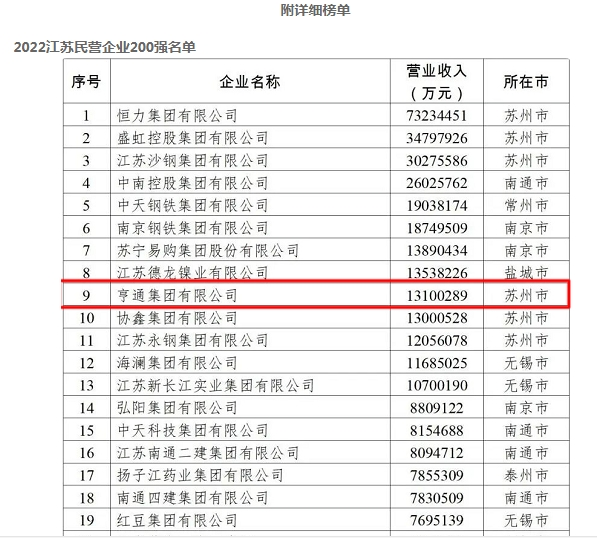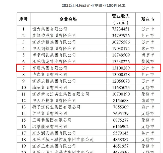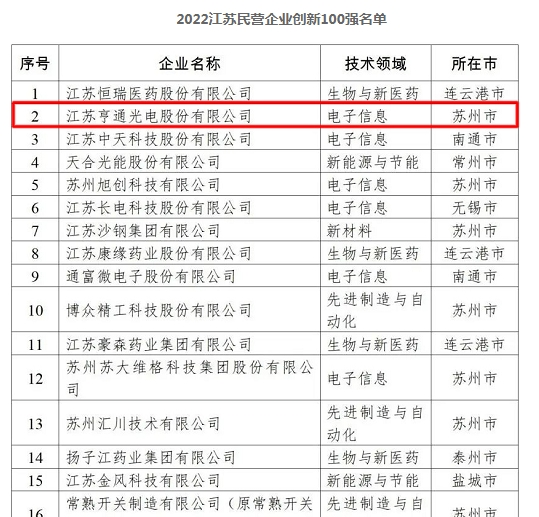 其中,亨通集团位列“2022江苏民营企业200强”第9位、“2022江苏民营企业制造业100强”第7位,江苏亨通光电股份有限公司荣登“2022江苏民营企业创新100强”第2名,相比去年提升1个位次。