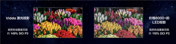 Vidda C1能够对行业有如此大的影响力,除了依靠扎实可靠的产品口碑之外,也离不开背后海信的强大技术底蕴做支持。在投影行业里有一句话:灯泡光源代表过去,LED光源代表着现在,激光光源就代表着未来。Vidda C1能够实现在亮度和画质上全面碾压对手,靠的就是其搭载的海信全色激光投影技术,这项技术的优势就是跳过单色激光,用真正能体现画质优势的全色激光作为光源,再加上超清的4K分辨率,Vidda C1一举成为智能投影界的“画质卷王”。