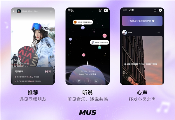 现阶段,MUS共有三个互动板块,分别为“推荐”、“听说”和“心声”。“推荐”板块,细分为“交友模式”和“音乐模式”。交友模式下,用户不仅能发现好音乐,还能高效地结识同频朋友;音乐模式下,用户可以更关注同频朋友推荐的好音乐。