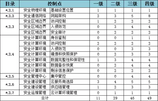 等级保护是我国在网络安全领域实施的重要制度之一,为使网络安全等级保护系列标准能够实现与时俱进,适应新技术、新应用的发展所提出的安全需求,《网络安全等级保护基本要求》2.0版本针对云计算、移动互联、物联网、工业控制系统和大数据共5个技术领域提出了安全扩展要求。云计算安全扩展要求章节针对云计算的特点提出特殊保护要求,对云计算环境主要增加的控制点包括“基础设施的位置”、“虚拟化安全保护”、“镜像和快照保护”、“云服务商选择”、“供应链管理”、“云计算环境管理”等方面。以最典型和最重要的第三级安全要求为例,该标准在7个层面(5个技术层面和2个管理层面)对16个控制点提出了共46条云计算安全扩展要求项。