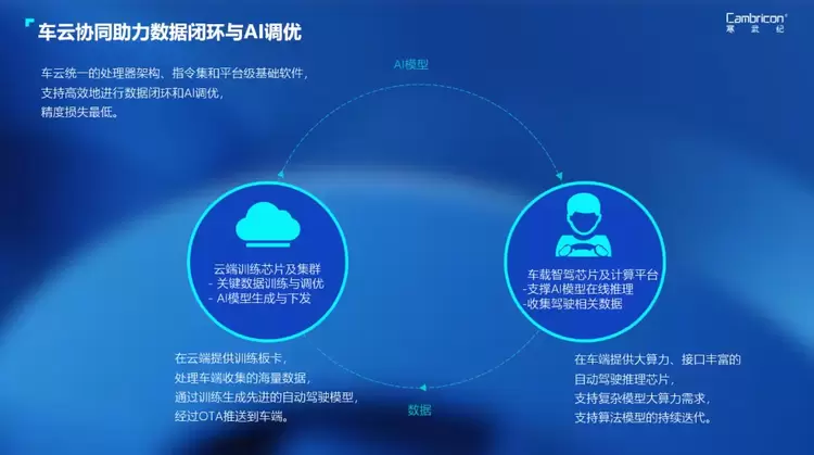 通过车云协同助力,可以实现数据闭环和AI模型持续优化。在云端,寒武纪拥有自己的训练芯片和集群产品。在车端,寒武纪行歌未来提供的车载智能芯片和计算平台将支持AI模型的在线推理。通过车云协同,能够将车端的数据快速回传,实现AI模型的快速迭代升级。