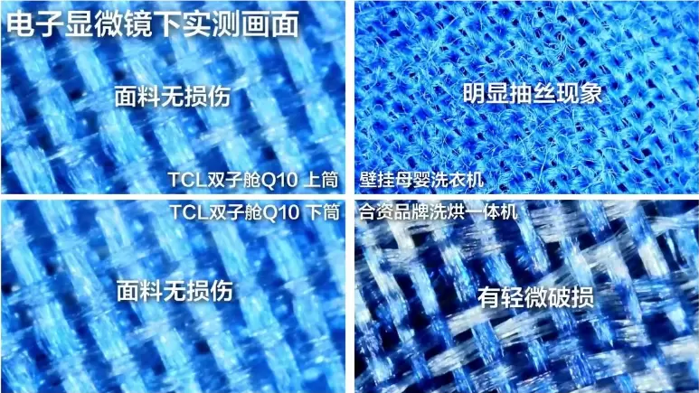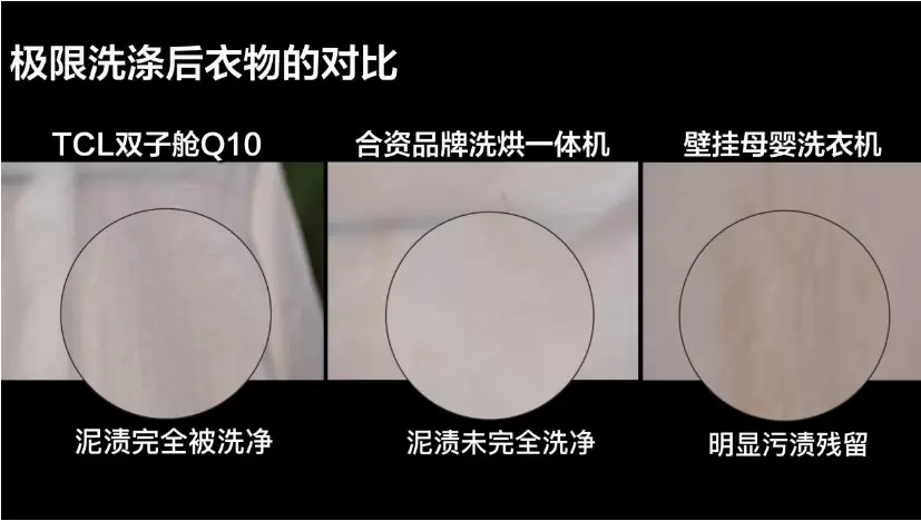 极限洗净环节中,组织孩子用泥巴在白布上作画,在泥潭中玩耍。将小朋友换下的脏衣服放入洗衣机上筒,和主持人的衣服分开洗涤。从视频的展示画面来看,TCL双子舱Q10的清洁效果明显优于其他两台洗衣机,衣服上看不出污染痕迹。这里评测团同样放大显示三块洗涤后的白布,可以看见,即使放大显示,经过TCL双子舱Q10洗涤的白布依然干净如新。