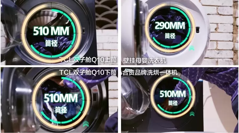 这里主要考察的是洗衣机的清洁功能,归根结底,洗衣机最基础的功能还是清洁。TCL双子舱Q10能有这么强大的清洁性能和形成这样柔和的护衣效果,很大程度上得益于这个大上筒。TCL双子舱Q10上筒筒径为510mm,大筒径为衣物提供了更长的摔打路径,成功达到了1.1的洗净比,超过所有同类型产品,做到了行业领先的洗净效果。与此同时,其使用的光滑水晶内筒,极大地减少了衣物在洗涤过程中与筒壁的摩擦。
