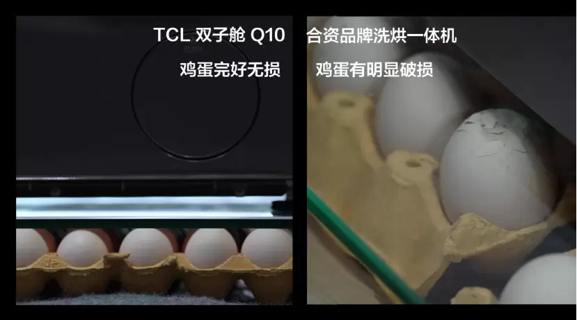 可以说这是最重量级的一项挑战。三台洗衣机在这一环节接受最为严苛的平衡与安静检测。洗衣机被放在由鸡蛋和玻璃制作成的“极限平衡挑战”装置上,同时在洗衣机上放置分贝检测仪,对比各洗衣机的运行情况。这样“惊险”的环节结束后,极限评测团还加大难度,在洗衣机上放置重力沙锤,然后启动洗衣机。从视频可以看出,TCL双子舱Q10在鸡蛋和玻璃装置上运行时,鸡蛋完全没有破损,重力沙锤也没有明显摆动。