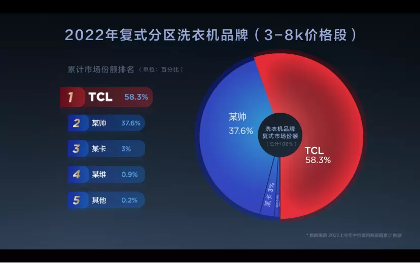 近期,艾媒咨询发布了《2022-2023年中国家电市场创新状况与消费者新需求调研报告》,调研数据显示超过七成的消费者倾向购买有实用性功能高端化智能家电。可以说,高端化、智能化已然成为家电消费的一大趋势,包括LG、海尔、美的这样的大家电品牌也瞄准了分区洗衣机赛道,持续发力。而TCL通过在分区洗衣机的持续发力,根据今年上半年电商平台上的销售数据统计,在3K-8K价格段TCL复式分区洗衣机的市场份额已经高达58.3%。并且,消费者的好评率也高达 98%。