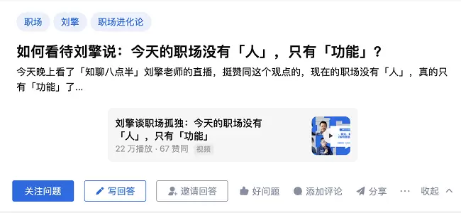 刘擎在节目中的观点很快在知乎发酵,“如何看待刘擎说:今天的职场没有‘人’,只有‘功能’”的问题下,知乎答主“塔可猫行动”回答到,这跟时代特征、生产力水平、专业细分等因素有关,“分工明确的副作用倒逼更明确的职业、功能划分出现,但坏处也大,可替代性强了”。