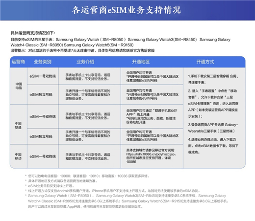 在入手并激活三星Galaxy Watch5 LTE版后,仅需进入手机“三星智能穿戴”应用的“手表设置”中点击“移动套餐”,允许下载并安装“三星eSIM卡管理器”应用。完成设置并进入运营商APP选择并办理对应的eSIM业务。办理成功后,三星Galaxy Watch5 LTE版即可连接数据网络并进行独立通讯,无需依赖手机连接。