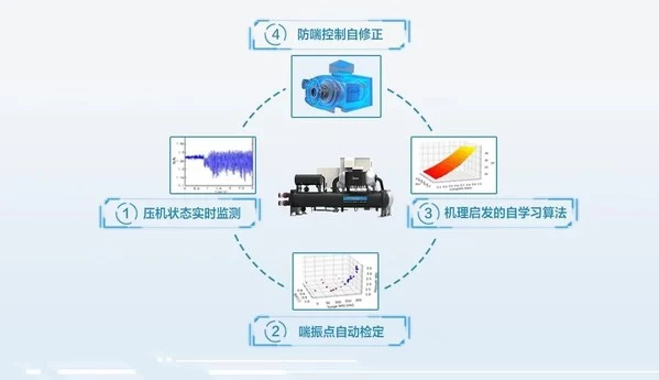 喘振(surge),是离心式压缩机在流量减少到一定程度时所发生的一种非正常工况下的振动,对于离心式压缩机有很严重的危害。美的楼宇科技在ChillerDoctor上研发的AI防喘振技术,实现了喘振的低成本精准检测,喘振面的全生命周期机理启发式自学习,动态优化防喘控制,在保证安全稳定长效运行的前提下,最大化离心水机的能量调节区间,全范围覆盖客户运行需求。