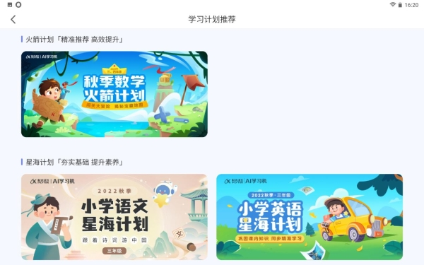 在星海计划版块,学生可以重点学习涵盖小学初中年级,覆盖语文、英语科目在内的全国各类主流教学版本的内容,科学地培养孩子的学习习惯,巩固基础知识。而针对理科的火箭计划,以小初高AI同步精准学为核心,学习机会精选出最重要的知识点,让学生以最少的时间学习最精华的内容,精准掌握学习内容。学习任务精准到以天为单位,为学生提供科学合理的AI学习计划,让学生能够系统性、规划性地学习,并在假期的自主学习中得到有效提升。此外AI学习机还新增了全科全场景的学习计划匹配,还会推荐不同学科的学习计划、打卡训练营等,坚持完成之后还可获得勋章奖励,增加学习的趣味性,让孩子在自主学习的过程中也能获得正向的积极反馈。