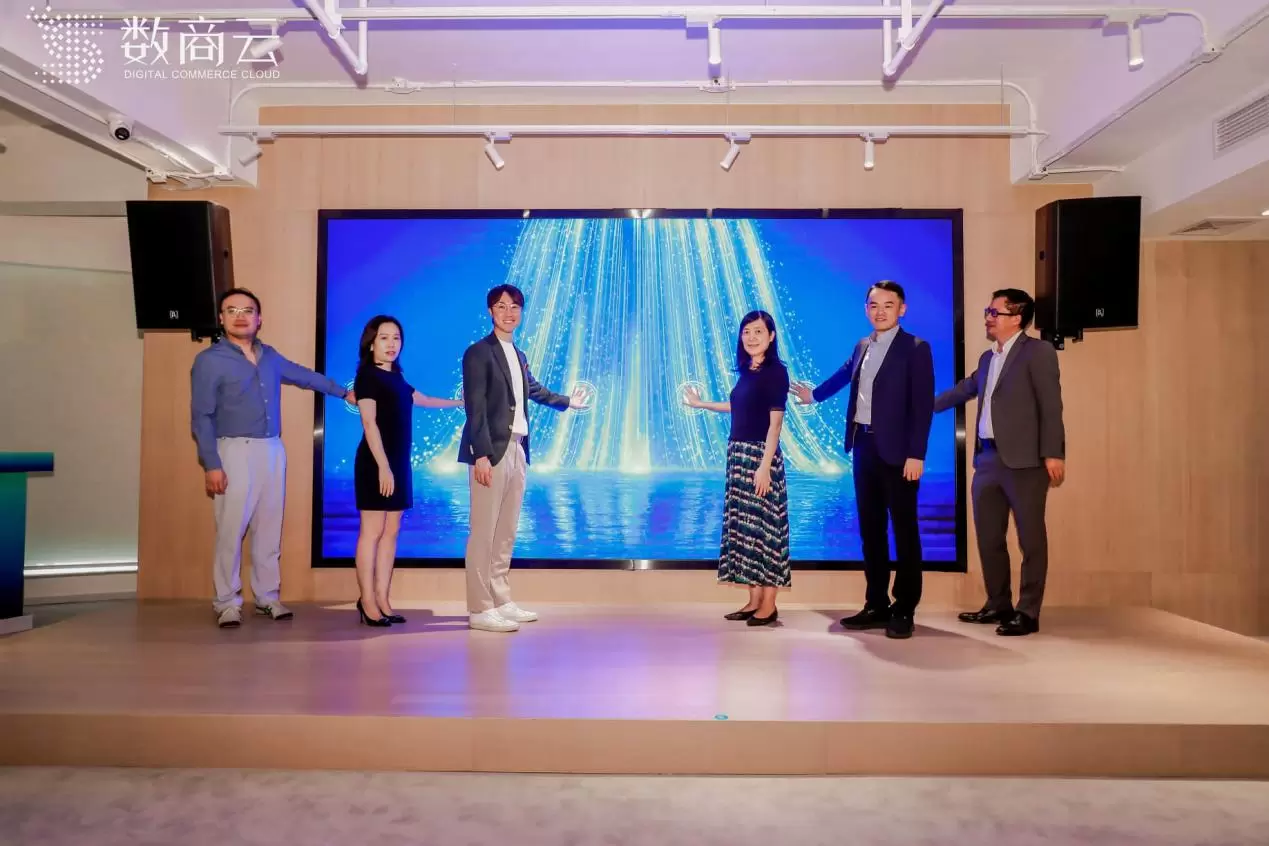 (从左到右依次:四大老友会陈煜先生、华进律师事务所合伙人袁璐女士、广州市政协委员吴嘉惠先生、天河区委统战部副部长余玲部长、数商云CEO谢建松先生、数商云销售副总裁夏睿先生)