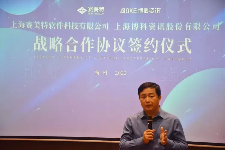赛美特董事长李钢江先生在会议上介绍,赛美特专注于国产智能制造软件平台的研发和应用,为半导体/泛半导体、装备制造、电子组装等应用场景提供一站式系统解决方案,是国产唯一可支持12吋晶圆厂全自动化生产的智能制造软件供应商。李钢江表示,此次与博科资讯的共同携手,将打造出“赛美特MES+博科高端ERP”的强强组合,实现智能工厂的全方位国产化与数字化的革新;希望在接下里的合作中,双方都能不断创新、共创共赢。