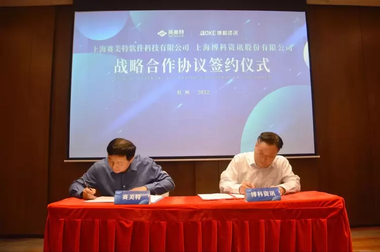 9月24日上午,博科资讯与上海赛美特软件科技有限公司(下称“赛美特”)在杭州签署战略合作。博科资讯董事长沈国康、赛美特董事长李钢江出席了签约仪式,双方将在半导体/泛半导体智能制造与企业数字化管理等相关领域开展战略合作。