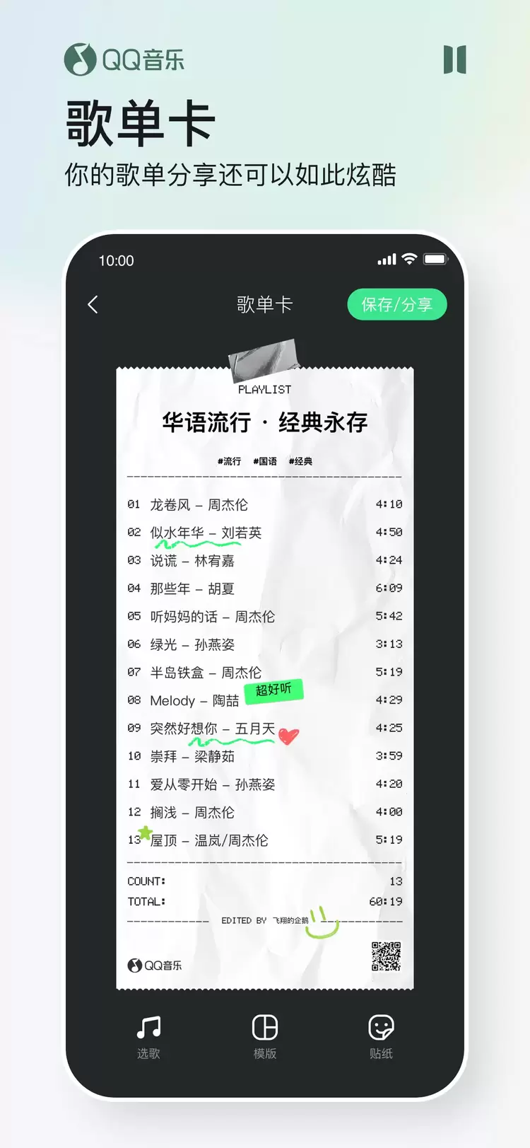 对于很多用户,尤其是社交达人来讲,歌单的分享功能是必不可少的“刚需”,我们经常会将自己喜欢的单曲分享至朋友圈或者其它社交平台。在QQ音乐新版本中,全新的【歌单卡】满足你多首歌曲分享的需求,选择自己喜欢的歌曲,随心分享自定义歌单。除此之外,还可以根据不同主题,选择不同风格的背景模板和趣味Plog贴纸素材,亲手DIY一张专属的【歌单卡】出来,记录和分享自己的听歌心情,让小小的歌单卡也充满故事感。
