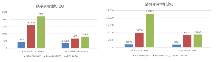 经典的RAID 0场景由8块960G的SATA SSD和8i的2G内存组成。在将RAID 0经典配置中的8块S4510 SATA SSD替换为4块浪潮技术创新的1.92T NS6510G1 NVMe SSD之后,可以得到对应的VROC方案,在16i的4G内存加持下,也可以得到4块RAID卡的Trimode方案。除了单盘性能对比之外,也可以明确:在具体的场景下NVMe SSD的表现更佳,尤其是VROC方案,能在成本上升不到20%的前提下性能提升2.2-11.2倍。