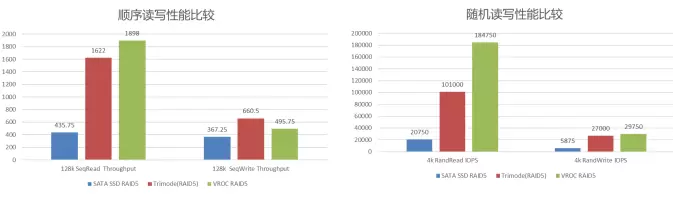RAID 5场景里,三种模式的顺序与随机读写性能比较