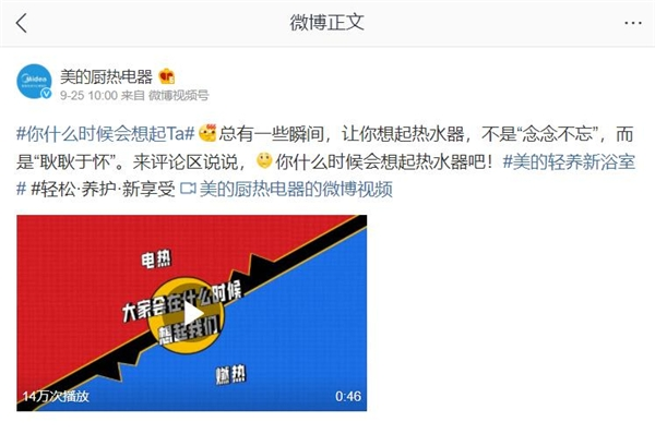 9月25日,美的厨热电器官方微博发起了#“你什么时候会想起热水器“#话题互动,瞬间吸引发了网友的热情参与,该话题“街头采访”视频,播放量更是高达14万次,转发量5228,一时间引爆网络话题热度。