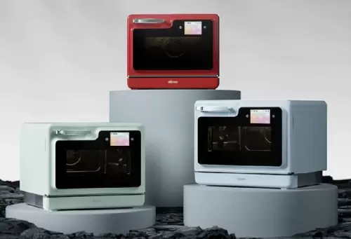在外形设计上,大厨也有许多令人视觉愉悦的设计。例如微蒸烤炸一体机,在造型风格上,让轻复古风格与现代科技相互碰撞,打破台式机的设计常规,一体式玻璃面板的不规则轮廓既新颖又优雅,全面屏的搭载让视界更广,用户可以实时观察美食的变化。