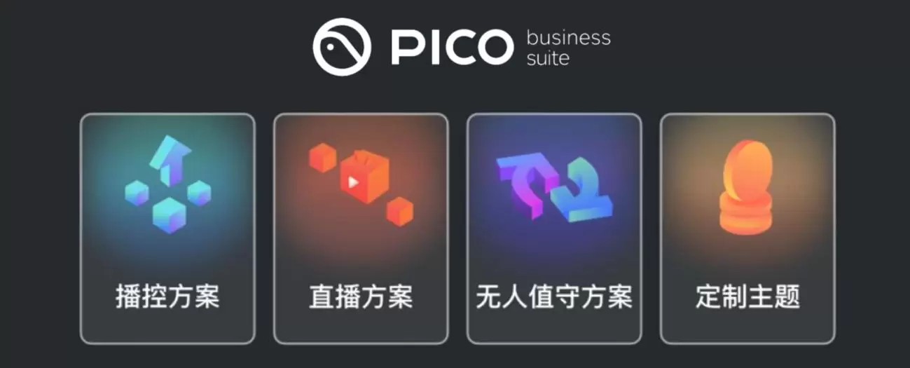 除了专门为企业用户打造的一流硬件之外,在行业解决方案上,PICO还为满足客户个性化定制方案需求而开发了PICO企业应用套件,包含播控方案、直播方案、无人值守方案、定制主题。