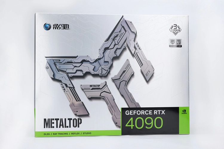 影驰 RTX4090 金属大师OC的包装盒上,金属大师系列经典的金属风格以及机械装甲设计