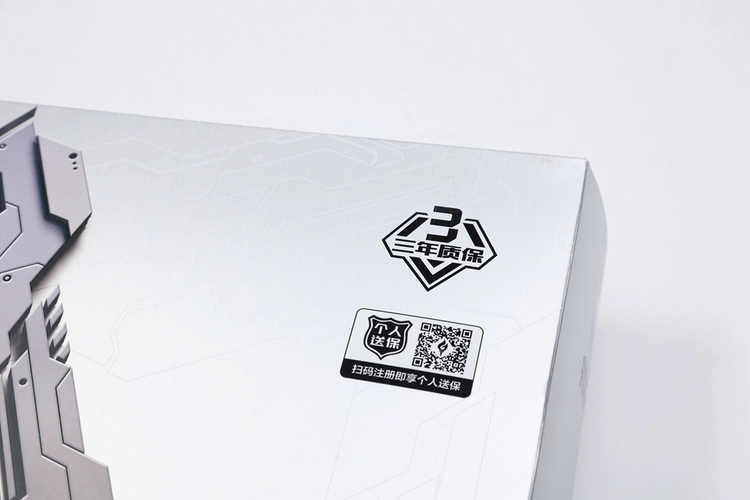 包装盒正面右上角,印有三年质保和个人送保标识,清晰可见,影驰RTX40全系显卡均支持此两项售后服务。