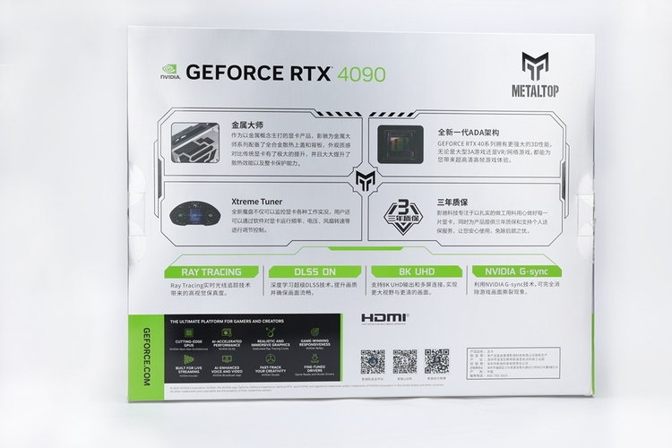 包装盒背面简要描述了影驰 RTX4090金属大师OC的部分产品特色,比如全合金上盖和背板、专属魔盘软件、RTX/8KHDR支持等等,玩家能够通过包装盒对这款显卡有着初步的了解。