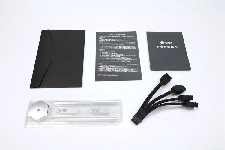 包装盒内,除了显卡本体以外,还附赠了1个显卡金属支撑杆,1根12VHPWR转8Pin*4电源转接线,另有指南说明书,便捷安装。