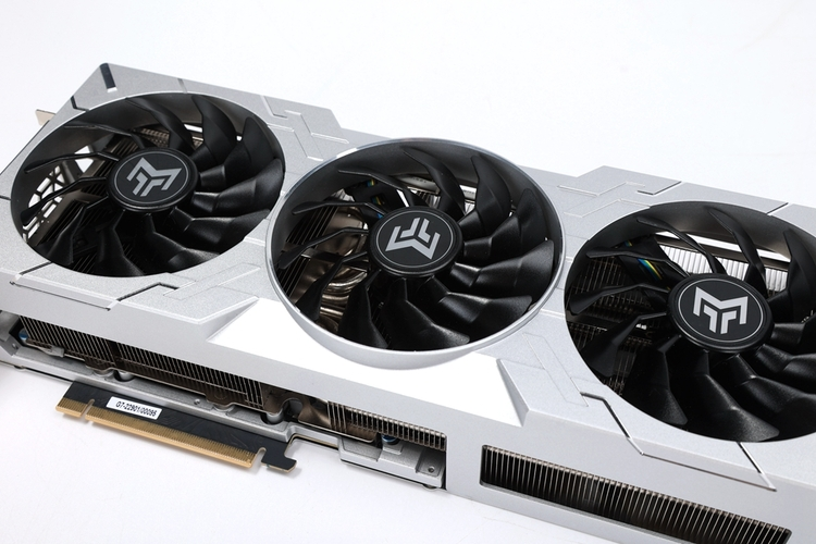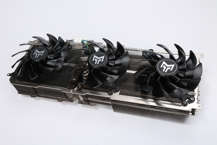 影驰 RTX4090金属大师OC拥有3个102mm超大面积静霜风扇,风扇厚度20mm,每个风扇带有11片三折式扇叶,进风量更大,风流更强劲;散热风扇均被固定在镀镍复合热管和大面积铜底上,以进一步强化散热。