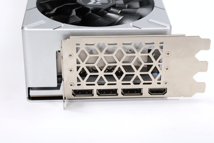 输出接口:显卡侧面装有镂空金属挡板,便于安装和协助散热,搭配金属支撑杆可稳固支撑显卡重量,同时对显卡输出接口进行金属加固。